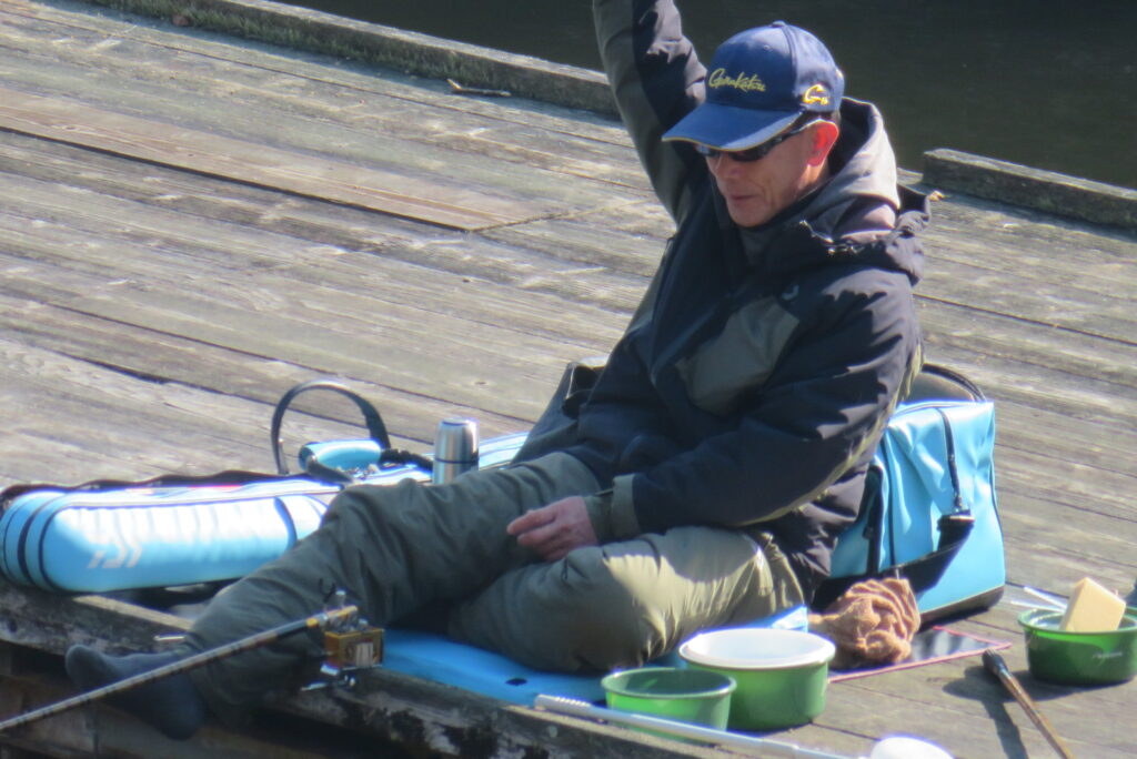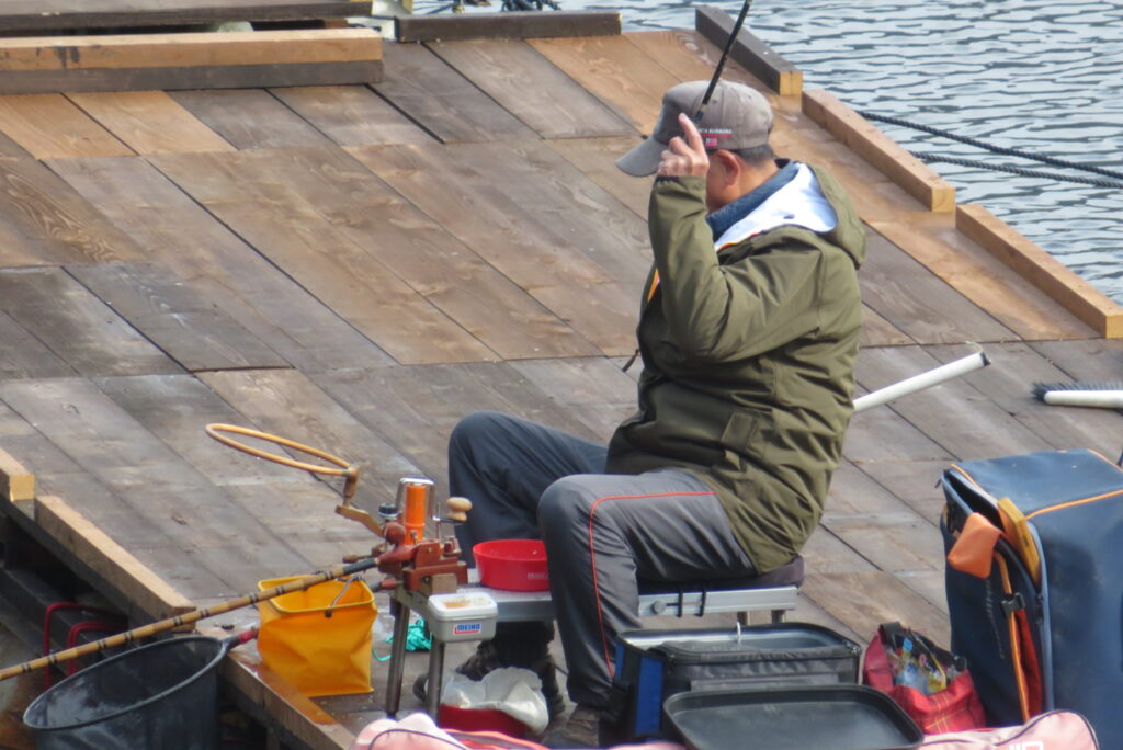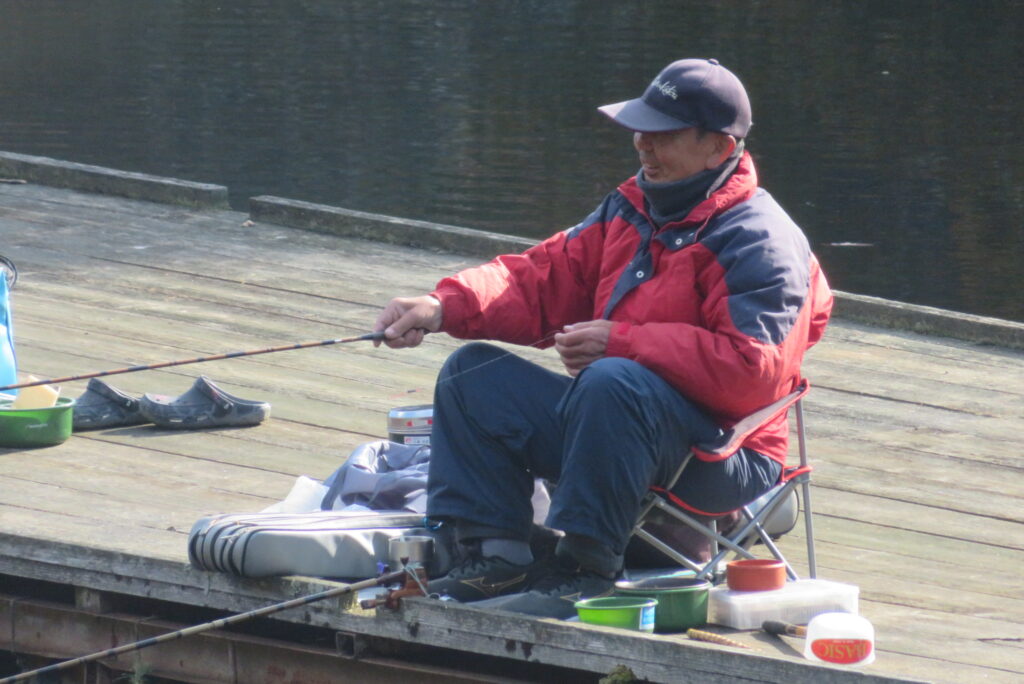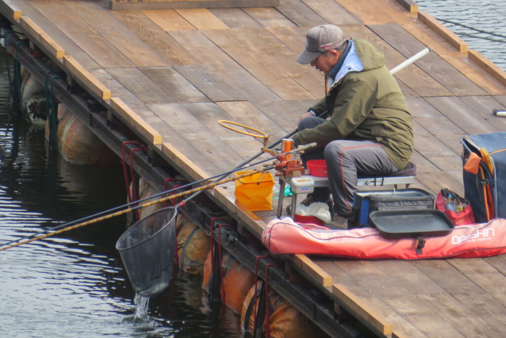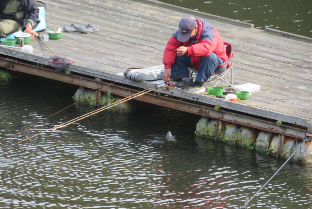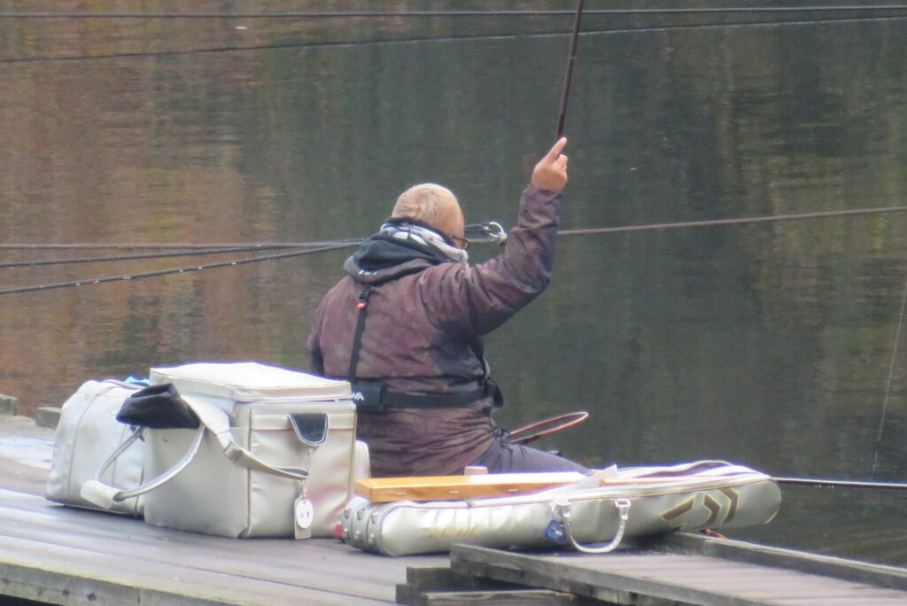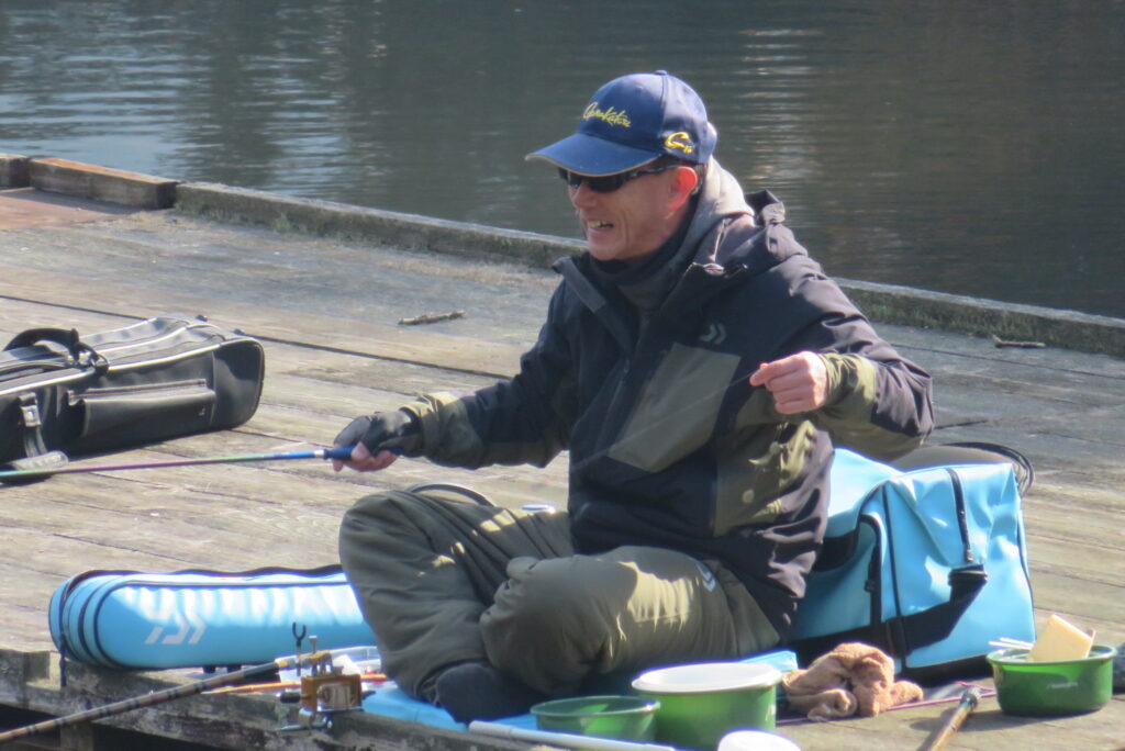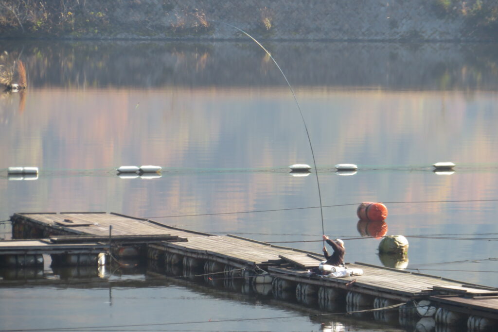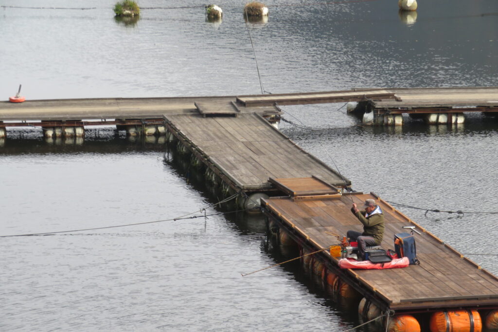満水・晴れのち曇り・無風で穏やかな1日でした。京都の長谷川様2-4号桟橋・竿12尺・ウドンセット、両ダンゴで25㎝~38㎝を50枚(~14:00まで)、5-2号桟橋山向き・竿22尺・床両ダンゴで25㎝~36㎝を44枚、4-2号桟橋・竿13.5尺・床両グルで30㎝~38㎝を22枚(~14:00)、そのほかのお客様も床釣りで6枚~20枚程度の釣果でした。今日も9時前にターンオーバーが起き、水面の冷たい水が池底に入り、舞い上がった底の泥の粒子が水面に浮遊していました。2号桟橋の朝一は多くのヘラブナが寄って湧き湧き状態でしたが、ターンオーバーのタイミングで湧き湧きが解消して、ターンオーバー後もコンスタントに釣れました。14時の早仕舞いでしたが50枚釣果で数釣りが楽しめました。4号桟橋・5号桟橋・8号桟橋のお客様は全員が床釣りでした。5-2号桟橋山向きが好釣で、午後に活性があがり釣れ続きました。4号桟橋・8号桟橋は数釣りとはなりませんでしたが、のんびりとアタリを楽しんでいただきました。本日もお越しいただき、ありがとうございました。