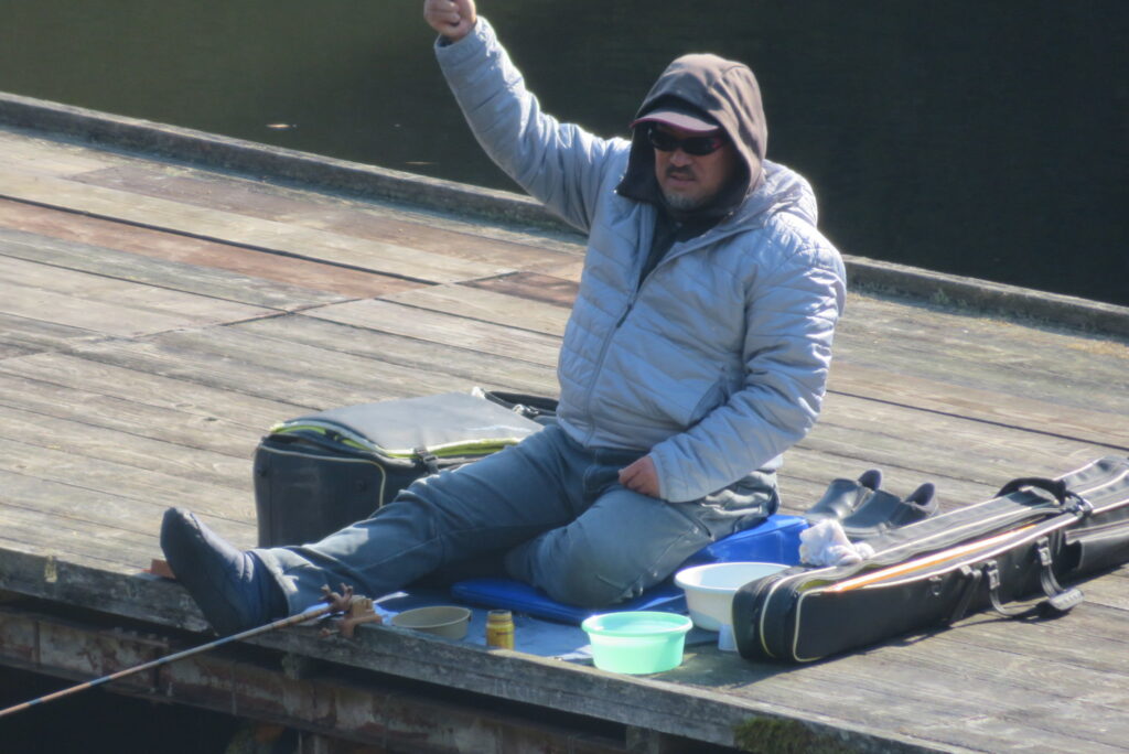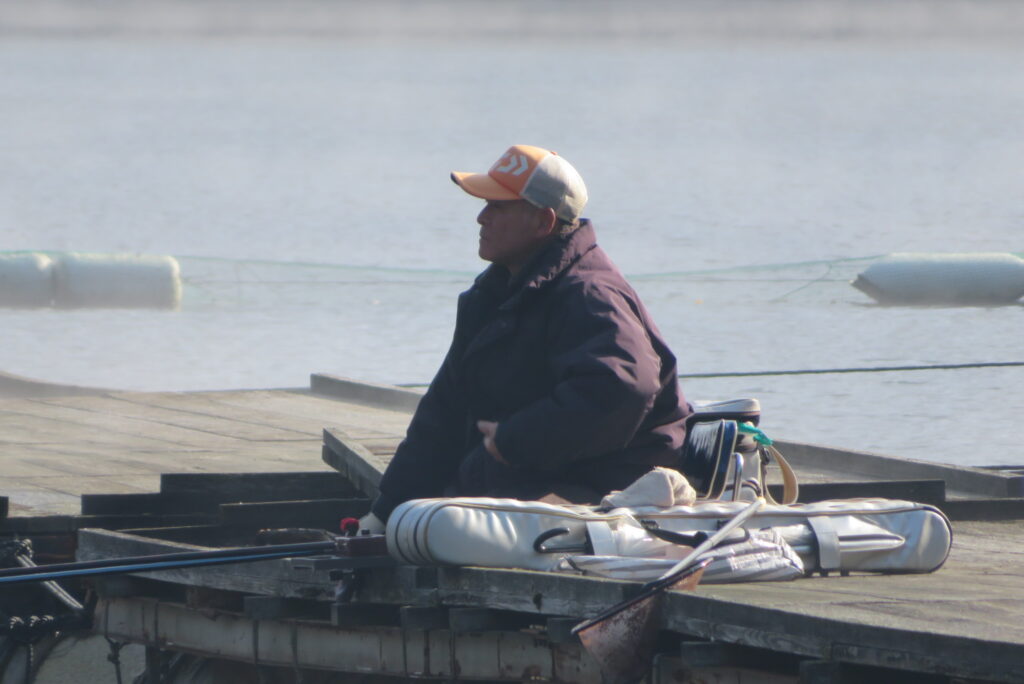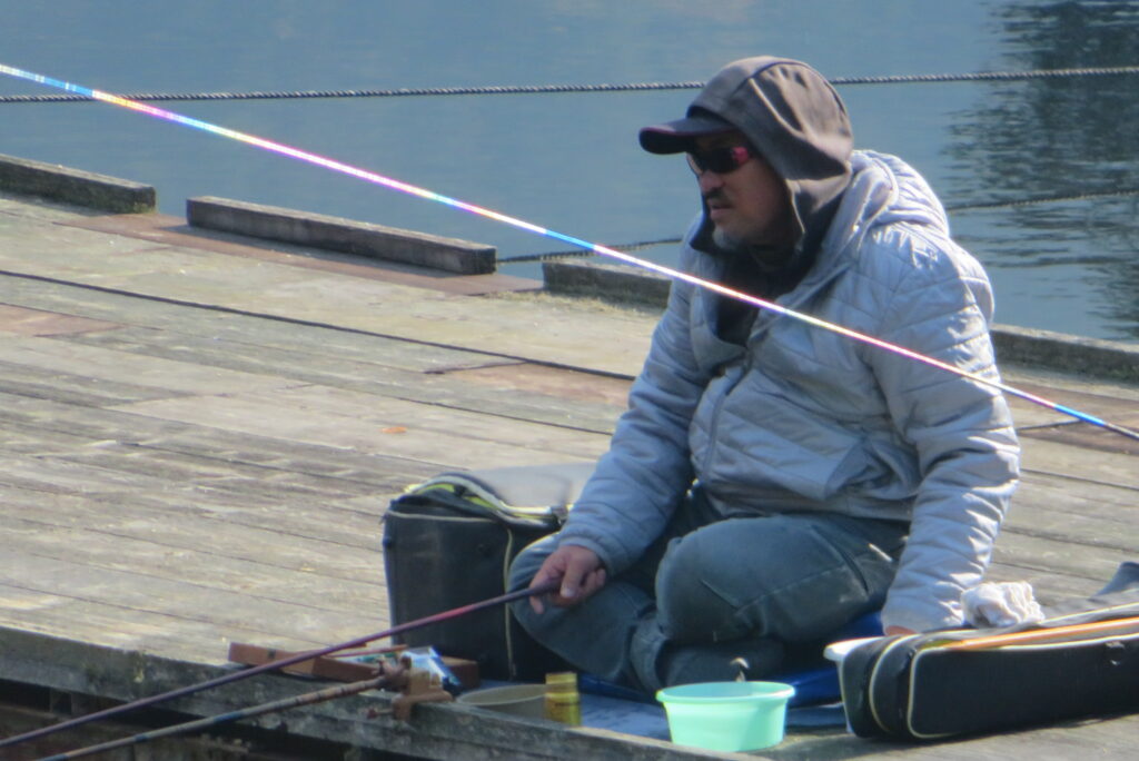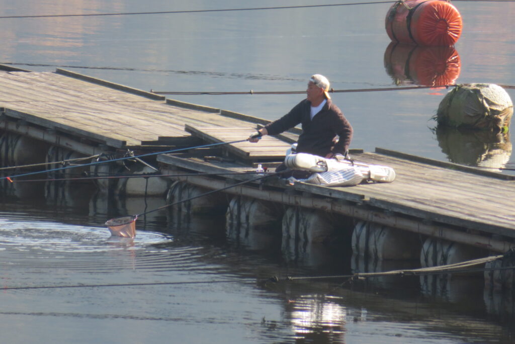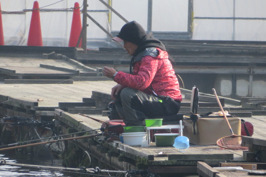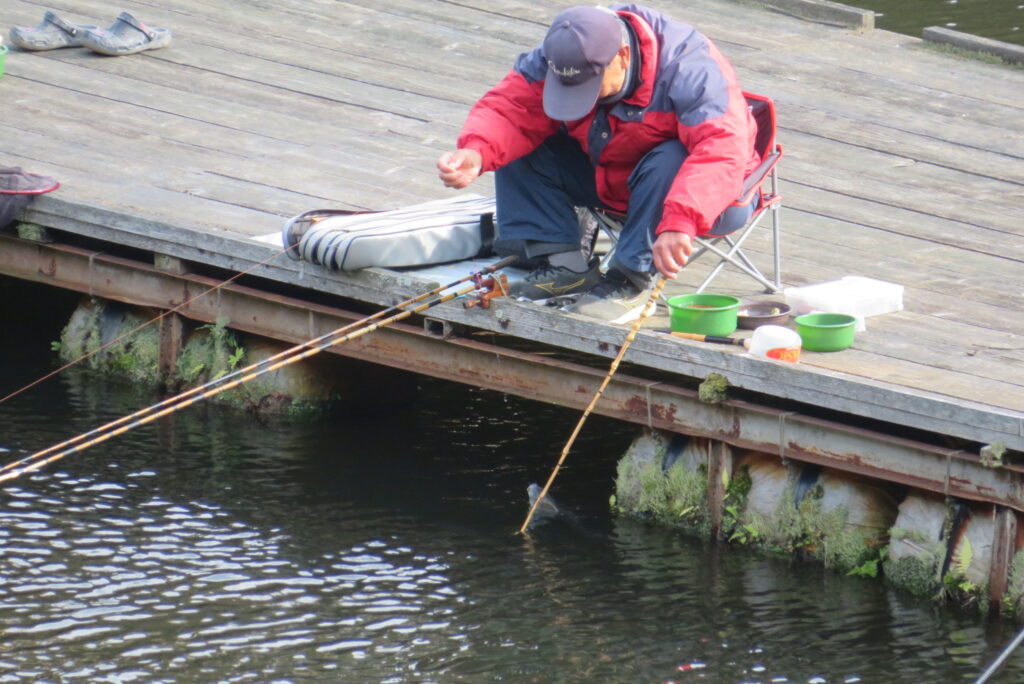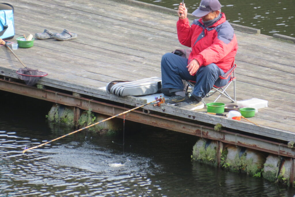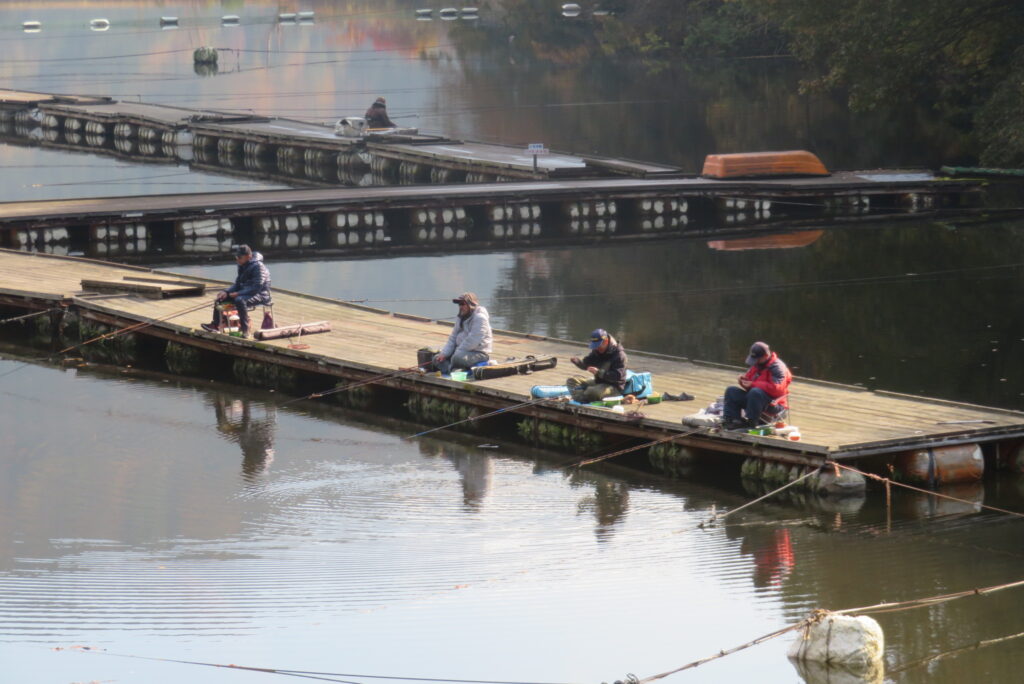 満水・晴れのち曇り・無風で穏やかな1日でした。京都の長谷川様2-4号桟橋・竿12尺・ウドンセット、両ダンゴで25㎝~38㎝を50枚(~14:00まで)、5-2号桟橋山向き・竿22尺・床両ダンゴで25㎝~36㎝を44枚、4-2号桟橋・竿13.5尺・床両グルで30㎝~38㎝を22枚(~14:00)、そのほかのお客様も床釣りで6枚~20枚程度の釣果でした。今日も9時前にターンオーバーが起き、水面の冷たい水が池底に入り、舞い上がった底の泥の粒子が水面に浮遊していました。2号桟橋の朝一は多くのヘラブナが寄って湧き湧き状態でしたが、ターンオーバーのタイミングで湧き湧きが解消して、ターンオーバー後もコンスタントに釣れました。14時の早仕舞いでしたが50枚釣果で数釣りが楽しめました。4号桟橋・5号桟橋・8号桟橋のお客様は全員が床釣りでした。5-2号桟橋山向きが好釣で、午後に活性があがり釣れ続きました。4号桟橋・8号桟橋は数釣りとはなりませんでしたが、のんびりとアタリを楽しんでいただきました。本日もお越しいただき、ありがとうございました。