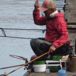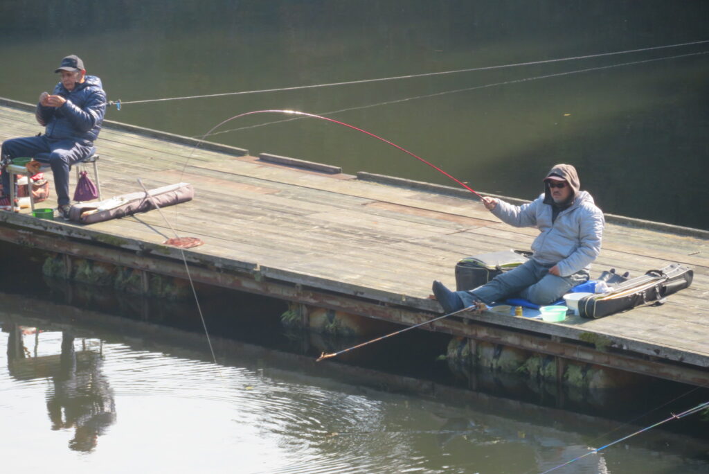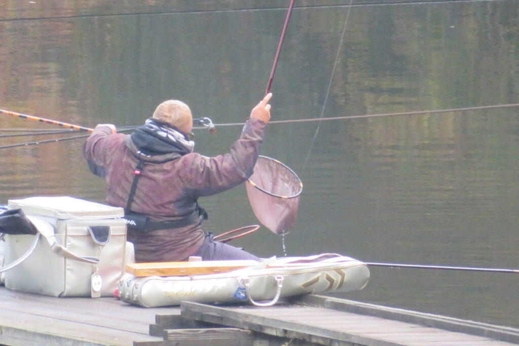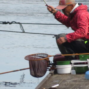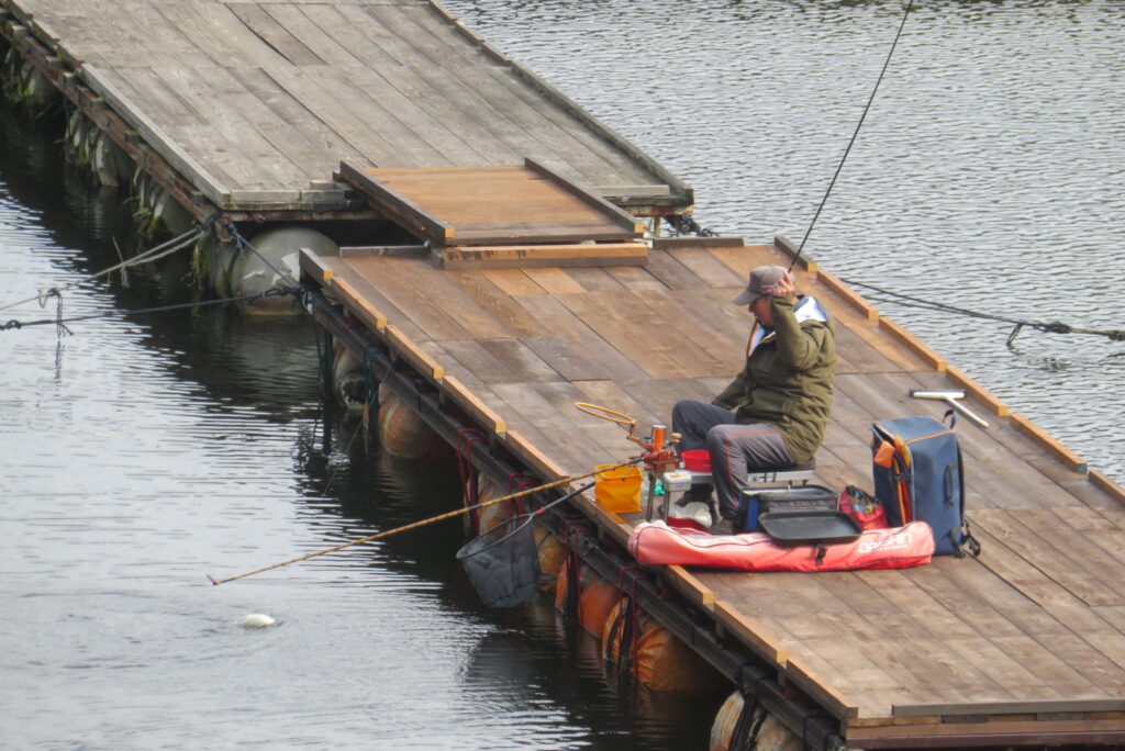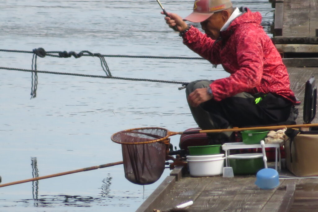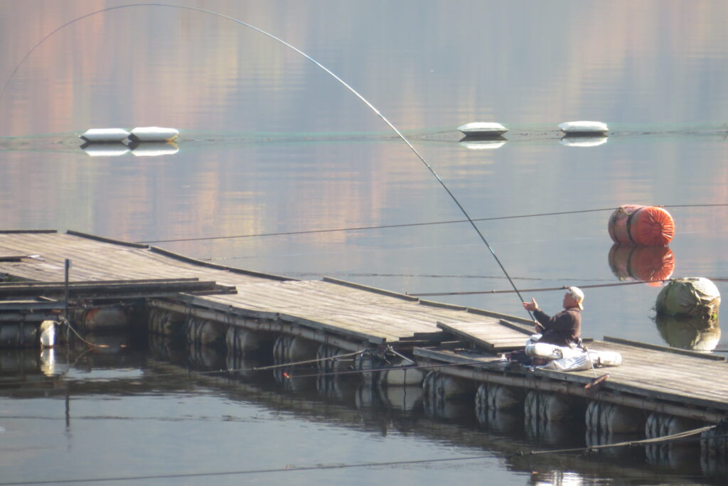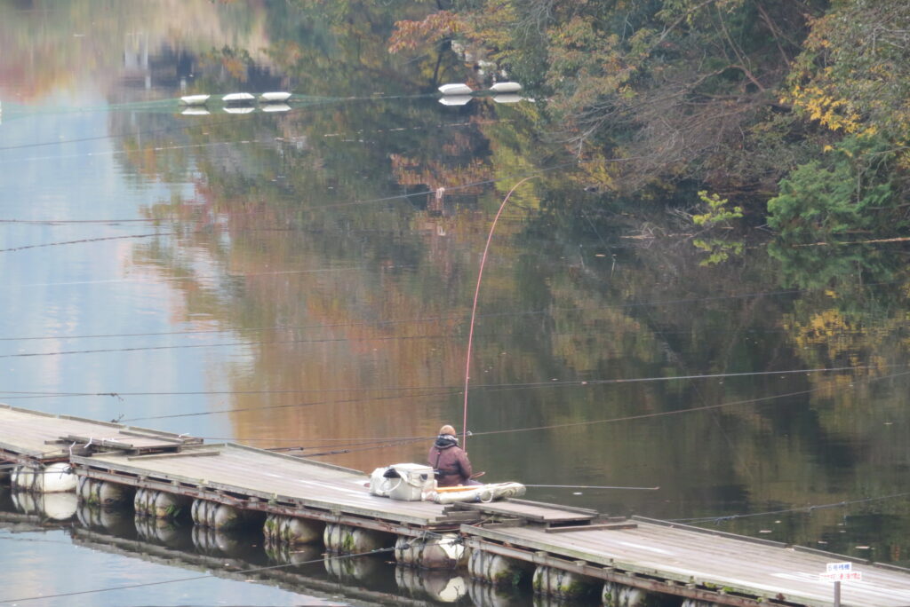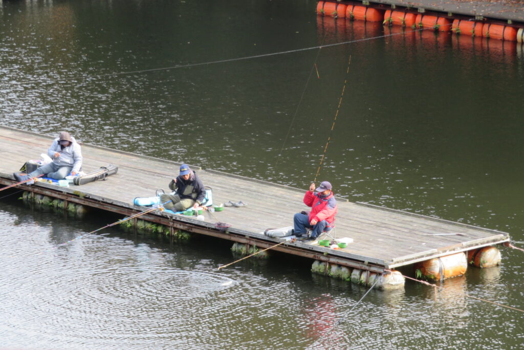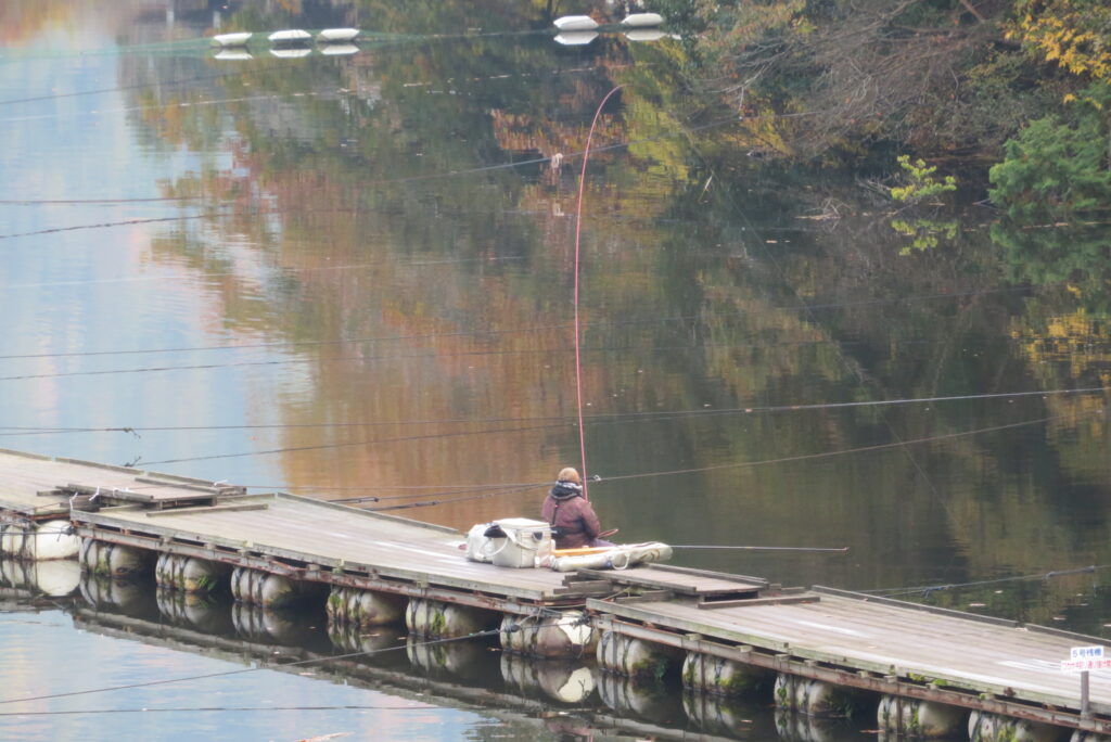 満水・晴れのち曇り・無風で穏やかな1日でした。京都の長谷川様2-4号桟橋・竿12尺・ウドンセット、両ダンゴで25㎝~38㎝を50枚(~14:00まで)、5-2号桟橋山向き・竿22尺・床両ダンゴで25㎝~36㎝を44枚、4-2号桟橋・竿13.5尺・床両グルで30㎝~38㎝を22枚(~14:00)、そのほかのお客様も床釣りで6枚~20枚程度の釣果でした。今日も9時前にターンオーバーが起き、水面の冷たい水が池底に入り、舞い上がった底の泥の粒子が水面に浮遊していました。2号桟橋の朝一は多くのヘラブナが寄って湧き湧き状態でしたが、ターンオーバーのタイミングで湧き湧きが解消して、ターンオーバー後もコンスタントに釣れました。14時の早仕舞いでしたが50枚釣果で数釣りが楽しめました。4号桟橋・5号桟橋・8号桟橋のお客様は全員が床釣りでした。5-2号桟橋山向きが好釣で、午後に活性があがり釣れ続きました。4号桟橋・8号桟橋は数釣りとはなりませんでしたが、のんびりとアタリを楽しんでいただきました。本日もお越しいただき、ありがとうございました。