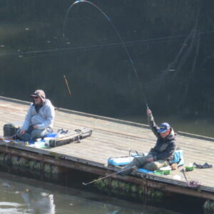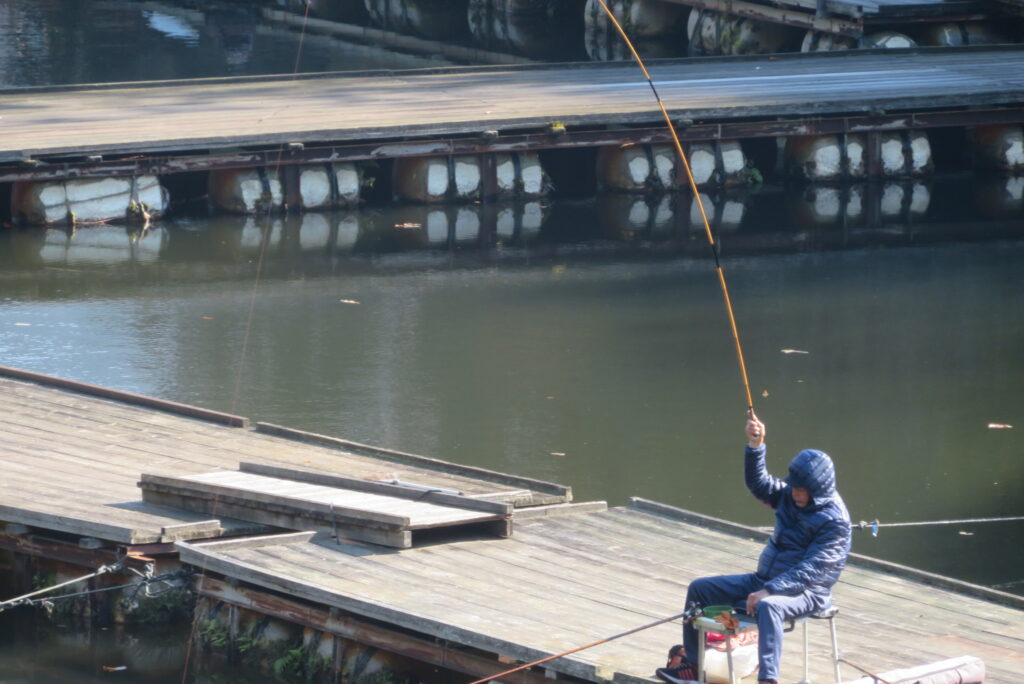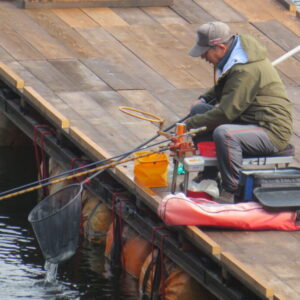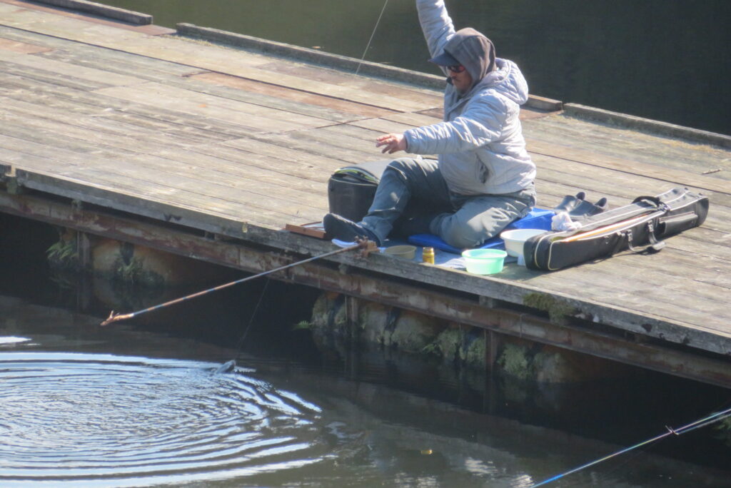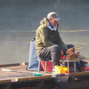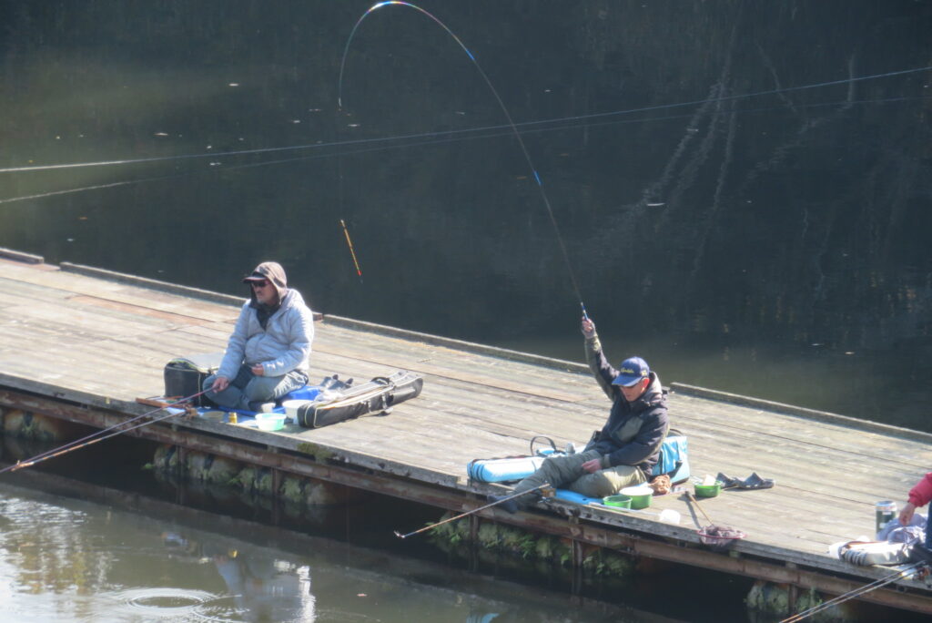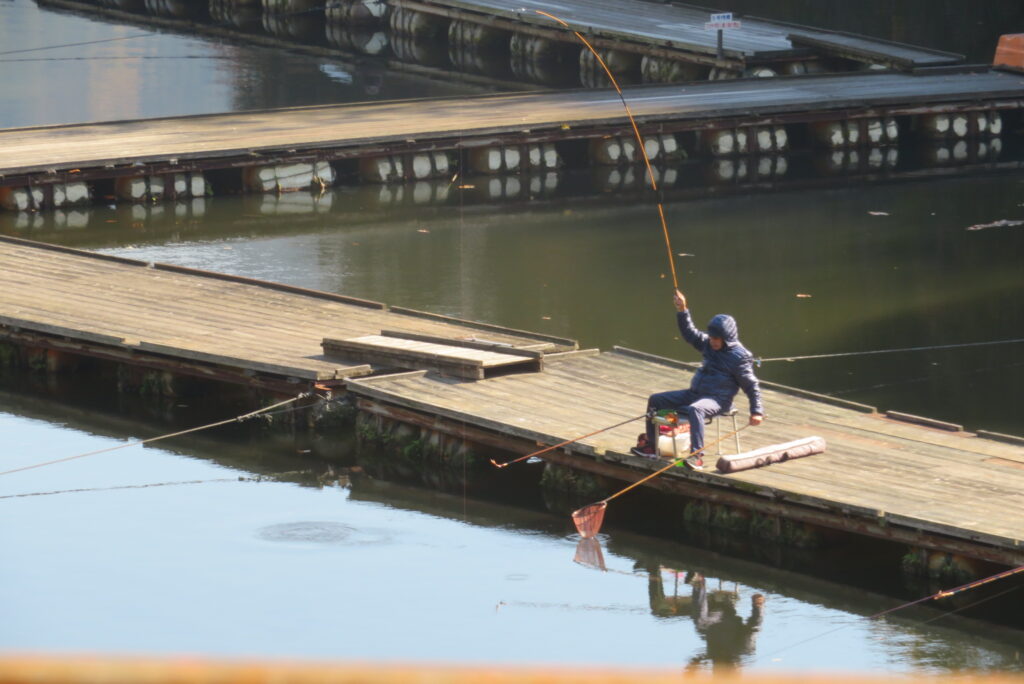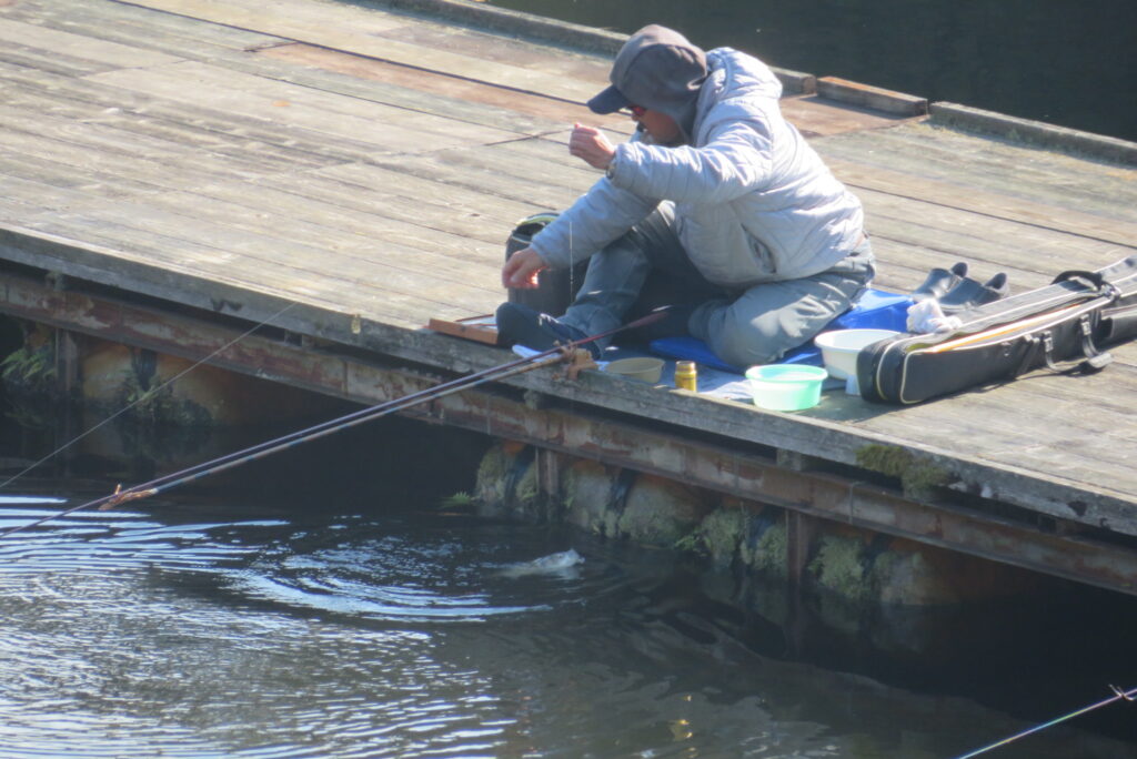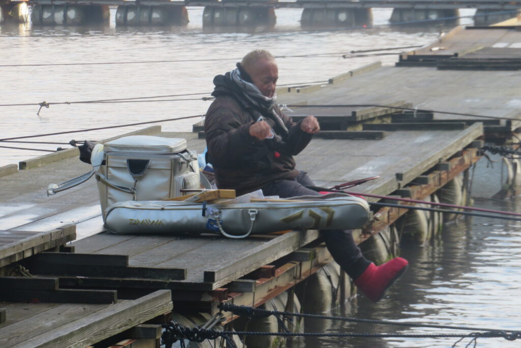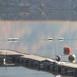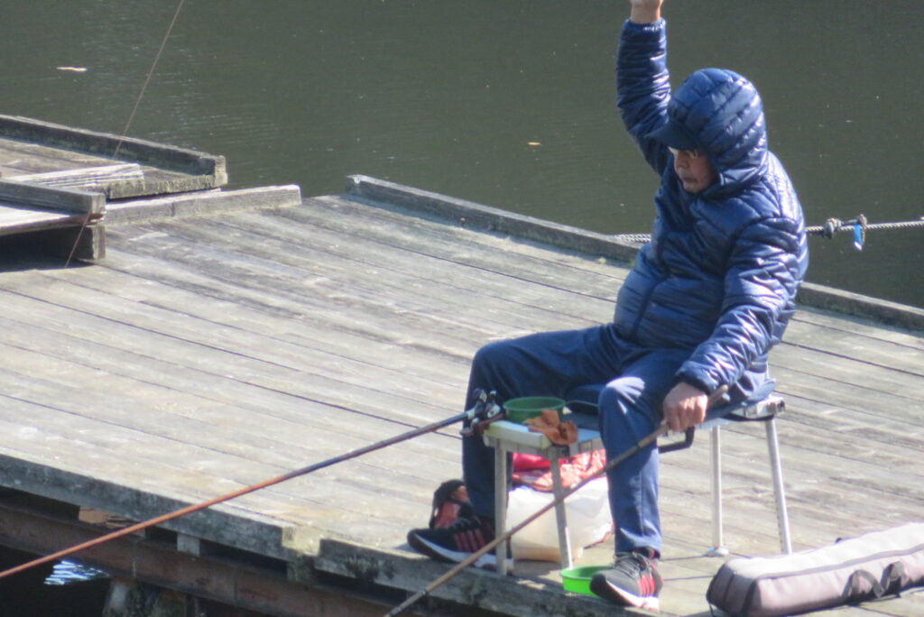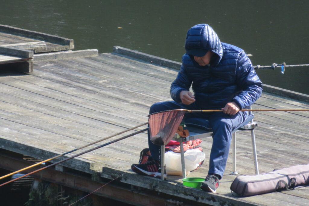 満水・晴れのち曇り・無風で穏やかな1日でした。京都の長谷川様2-4号桟橋・竿12尺・ウドンセット、両ダンゴで25㎝~38㎝を50枚(~14:00まで)、5-2号桟橋山向き・竿22尺・床両ダンゴで25㎝~36㎝を44枚、4-2号桟橋・竿13.5尺・床両グルで30㎝~38㎝を22枚(~14:00)、そのほかのお客様も床釣りで6枚~20枚程度の釣果でした。今日も9時前にターンオーバーが起き、水面の冷たい水が池底に入り、舞い上がった底の泥の粒子が水面に浮遊していました。2号桟橋の朝一は多くのヘラブナが寄って湧き湧き状態でしたが、ターンオーバーのタイミングで湧き湧きが解消して、ターンオーバー後もコンスタントに釣れました。14時の早仕舞いでしたが50枚釣果で数釣りが楽しめました。4号桟橋・5号桟橋・8号桟橋のお客様は全員が床釣りでした。5-2号桟橋山向きが好釣で、午後に活性があがり釣れ続きました。4号桟橋・8号桟橋は数釣りとはなりませんでしたが、のんびりとアタリを楽しんでいただきました。本日もお越しいただき、ありがとうございました。