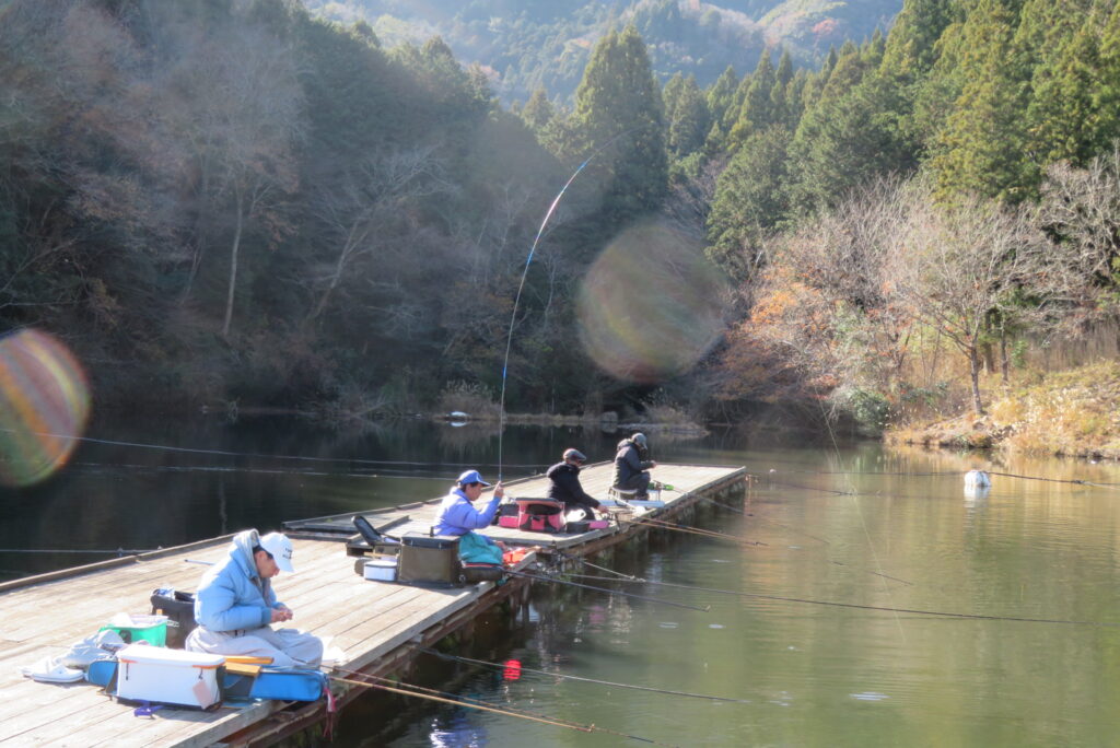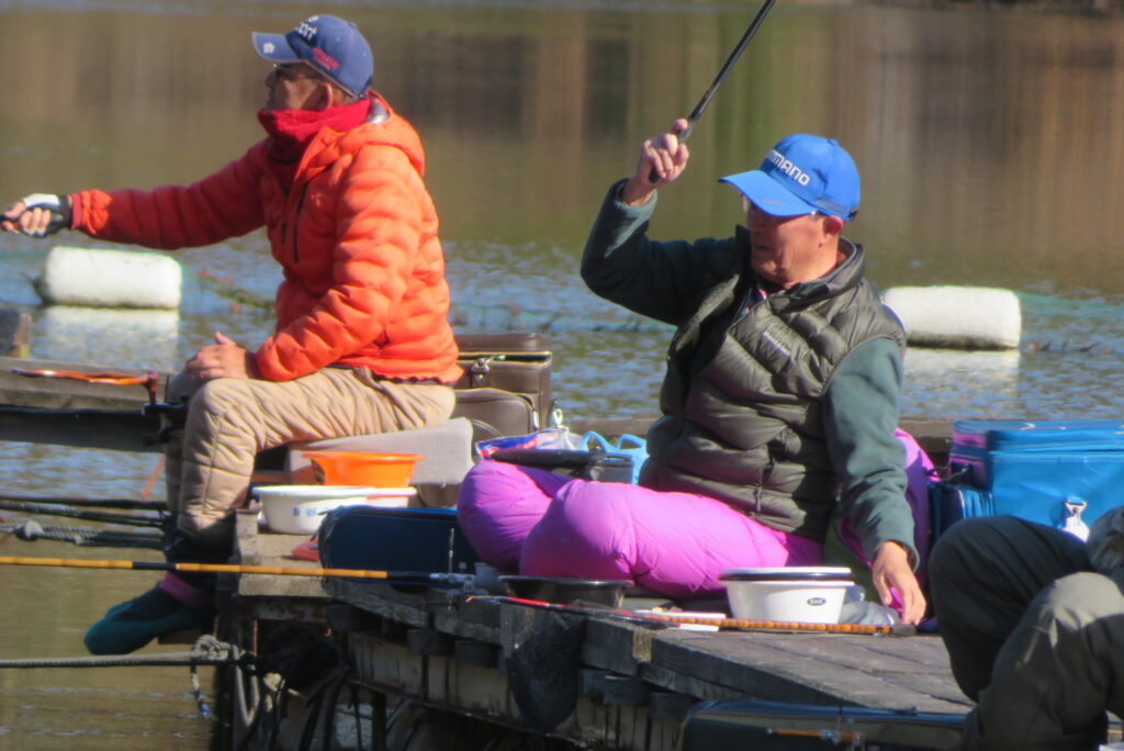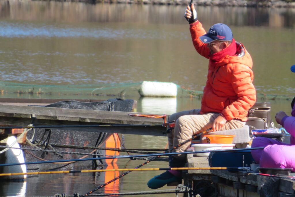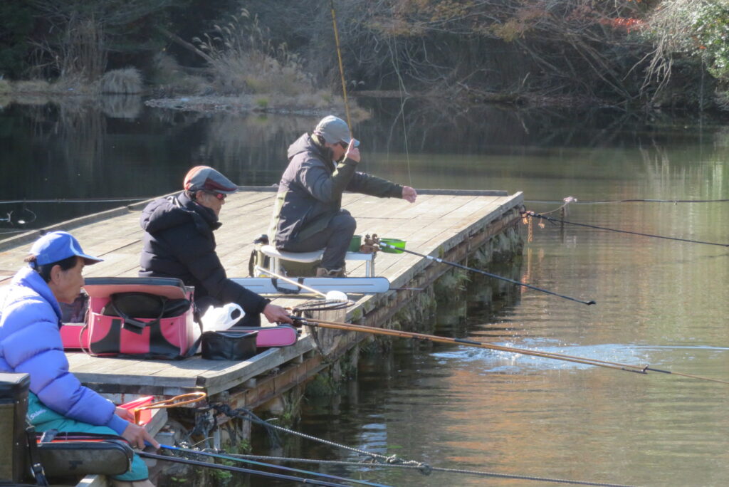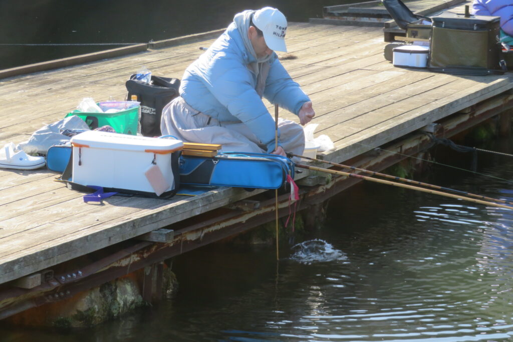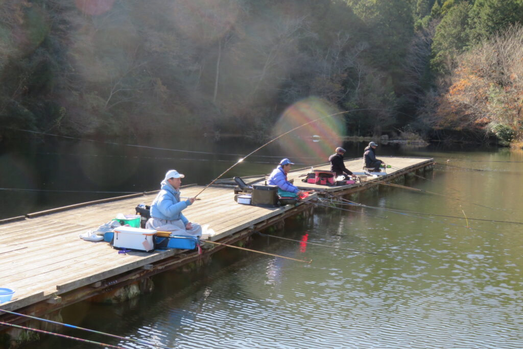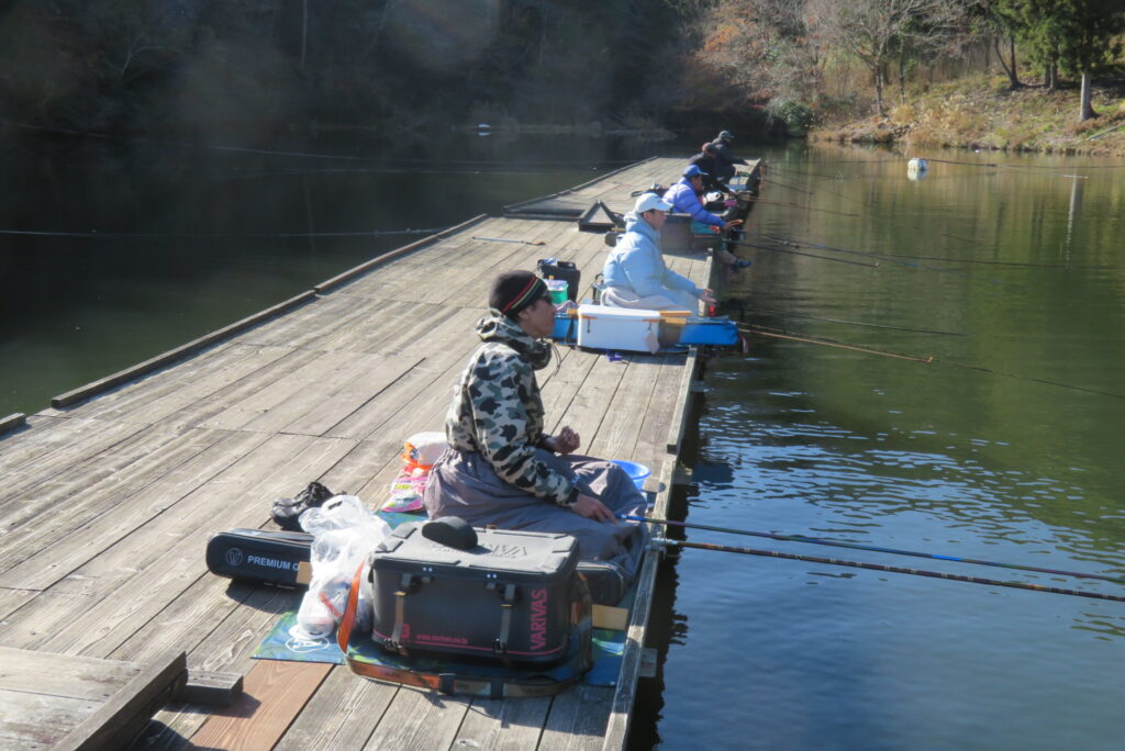 満水・晴れ・無風で穏やかな1日でした。枚方の渕田様3-5号桟橋道路向き・竿28.5尺・床グルテンセットで24㎝~41.8㎝を29枚、4-1号桟橋道路向き・竿21尺・床両グルで28㎝~36㎝を28枚、4-1号桟橋道路向き・竿16.5尺・段床で30㎝~36㎝を20枚、そのほかのお客様も数枚~17枚の釣果でした。朝一は3℃程度まで冷え込んだため釣れ出しは少し遅めでしたが、1日を通してアタリは継続しました。ウキ周りの浅棚に多くのヘラブナが寄っていた箇所もあり、短竿・セットであれば数釣りができた感じでした。明日14日(日)は、4-1号桟橋及び4-2号桟橋について例会予約が入っていますのでご承知をお願いします。本日もお越しいただき、ありがとうございました。