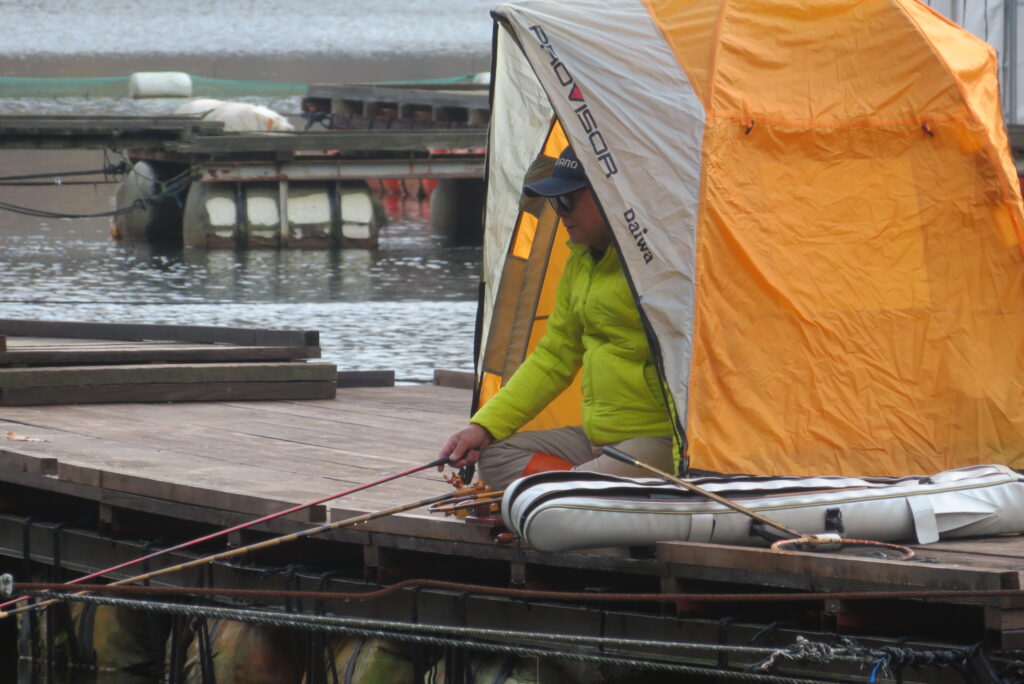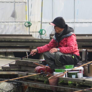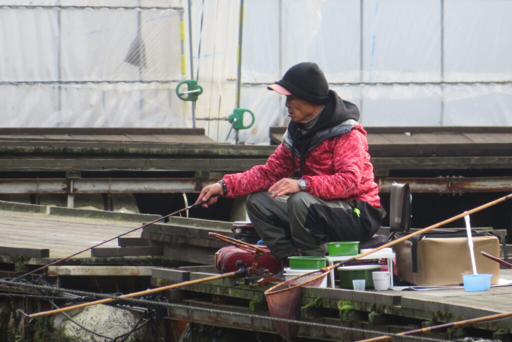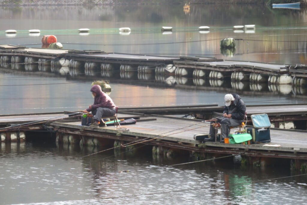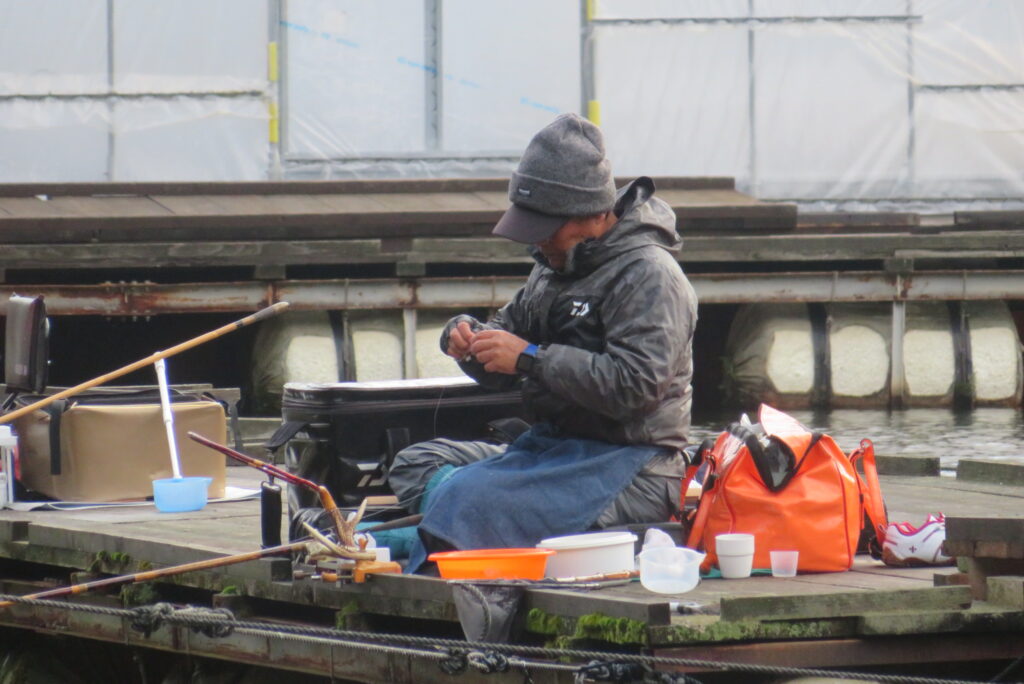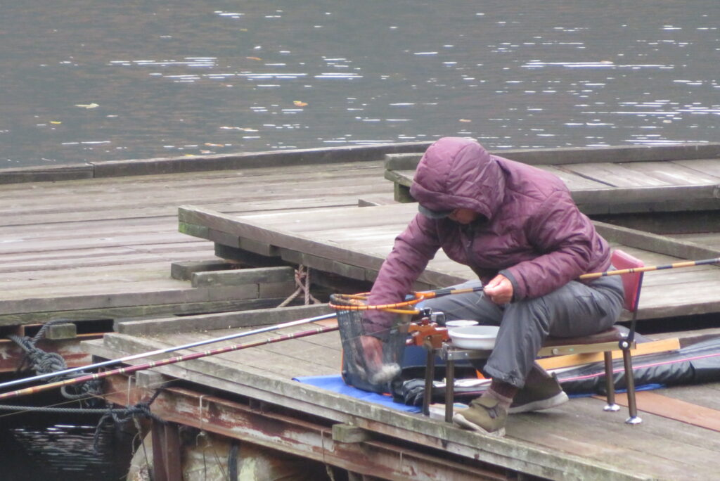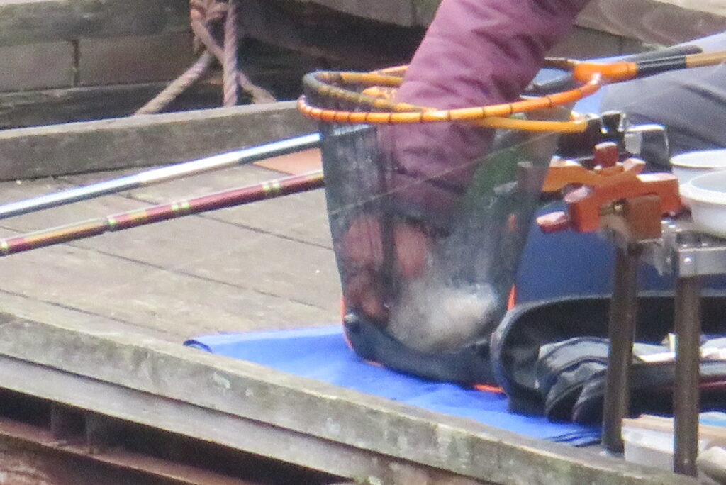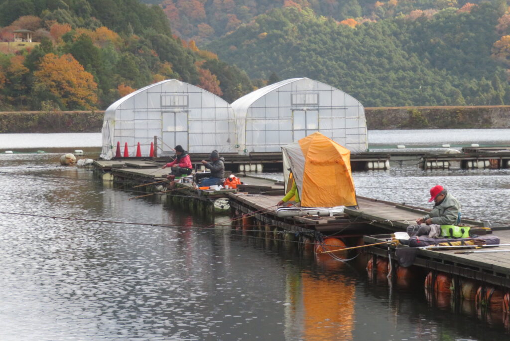 満水・曇り・無風のち弱風で寒い1日でした。今朝は冷え込みが弱くターンオーバーは起きませんでした。しかし、曇り空が続き昼前には冷たい風が吹き始め、気温も低いままでした。京都の長谷川様2-4号桟橋・竿10尺・ウドンセットで25㎝~38㎝を28枚(~14:00まで)、そのほかのお客様も数枚~20枚前後の釣果でした。昼過ぎから2号桟橋で竿出しされたお客様は15尺・両グルで18枚釣果・頻繁に竿が曲がっていました。朝の冷え込みで池水温も13℃程度まで低下し、セットのお客様が増えてきました。今日もヘラブナが湧き湧き上ずりでアタリを出すのが難しかった場所もある一方で、ハリスを長くしないとアタリが出ない場所もあり、秋から冬への移行期真っ最中です。桟橋によって季節が異なる感じで、エサ・仕掛け・棚等、いろいろ試してみてください。本日もお越しいただき、ありがとうございました。