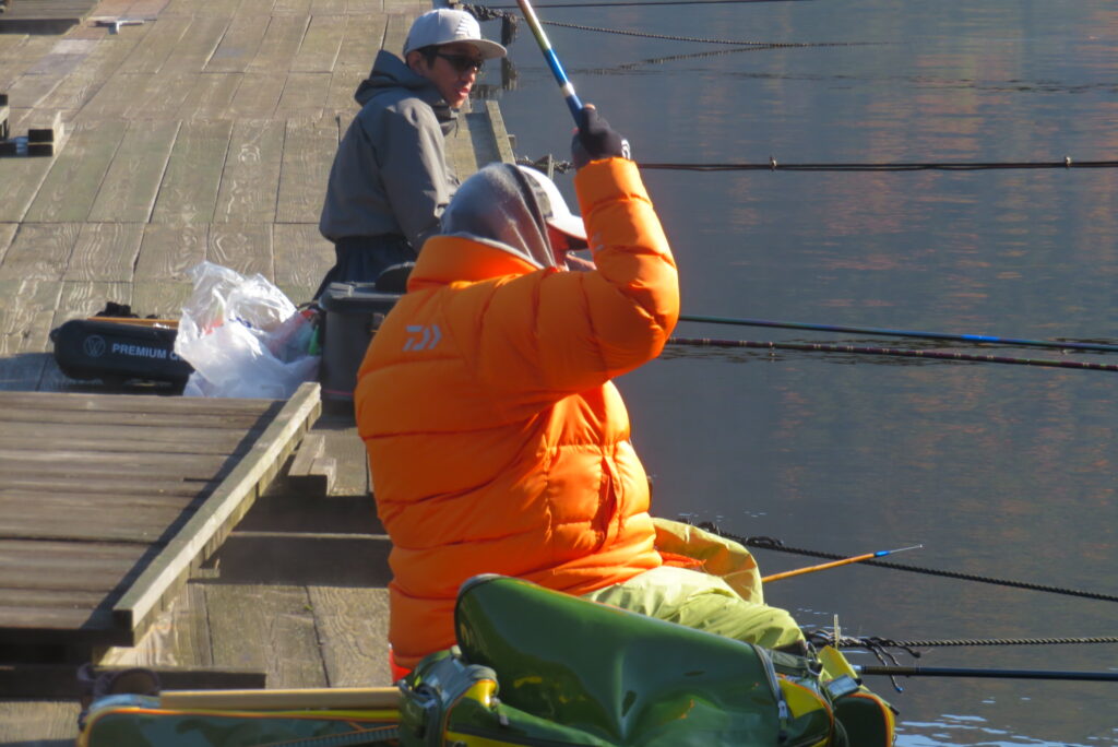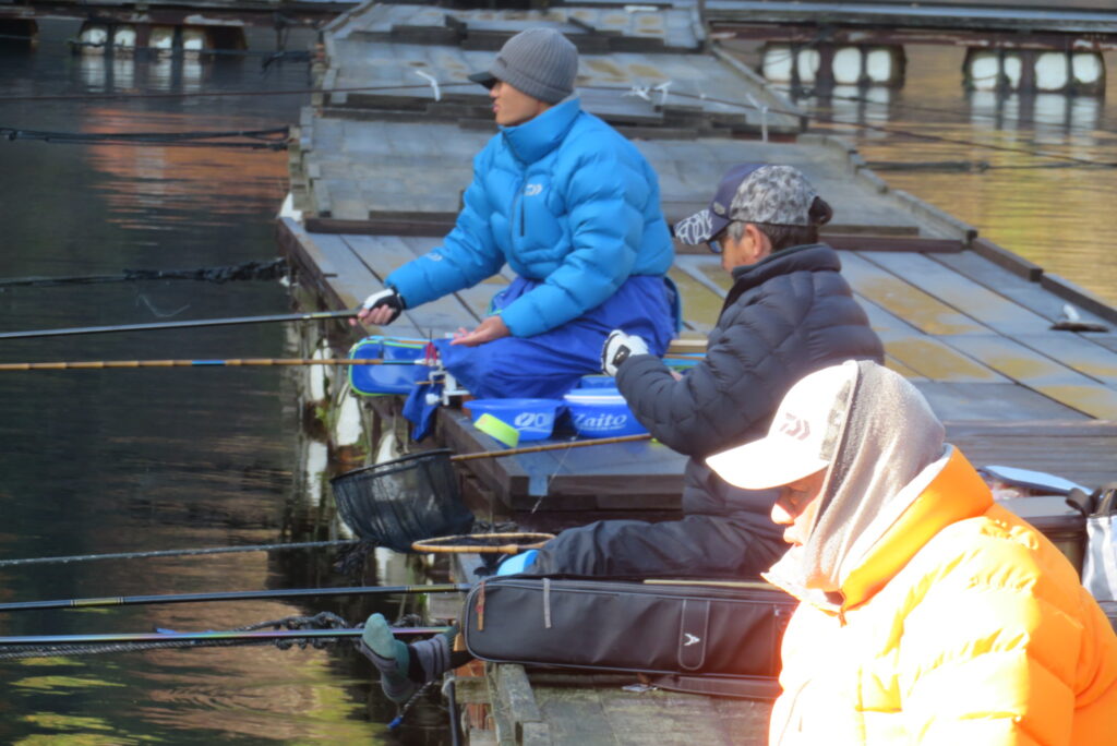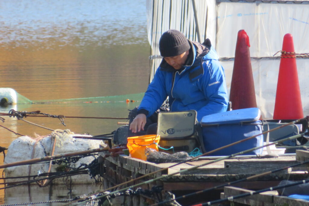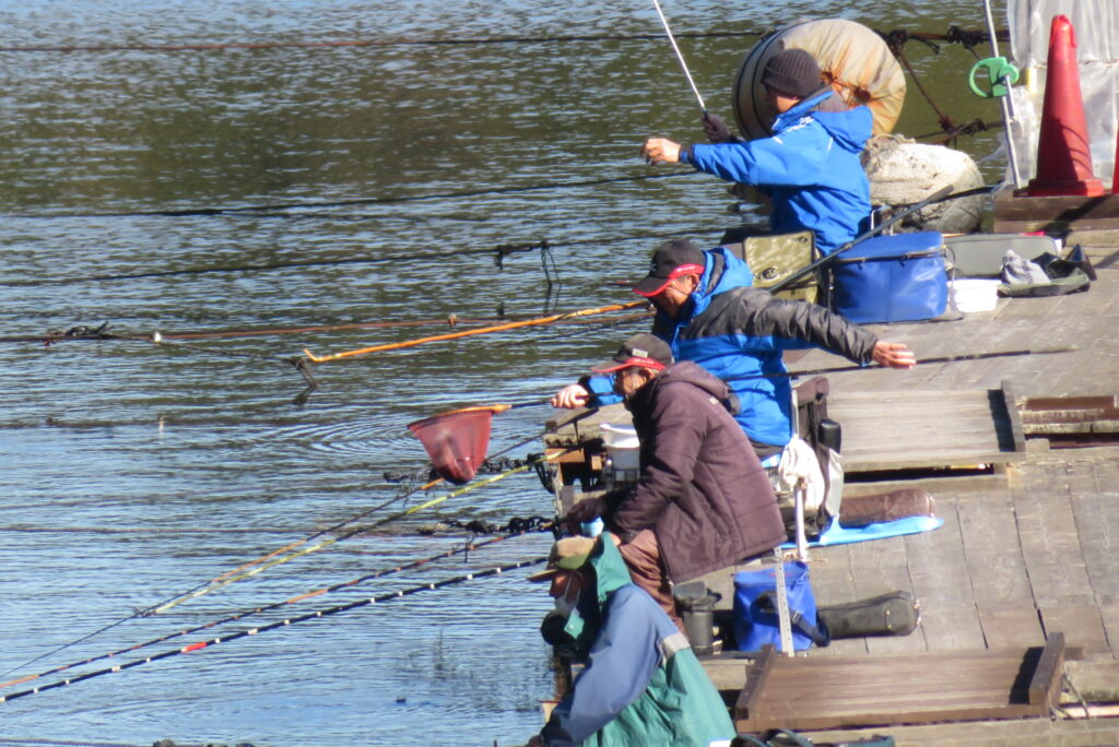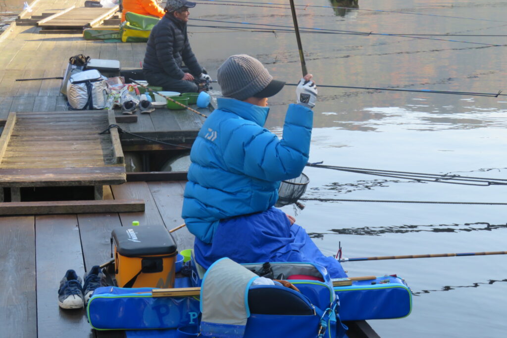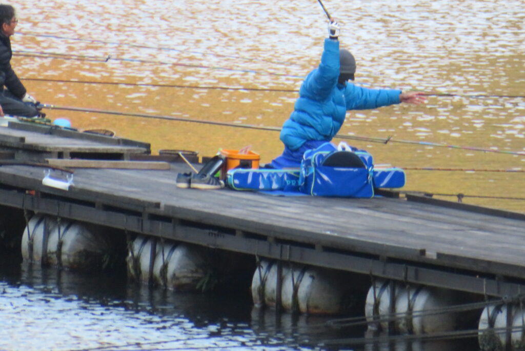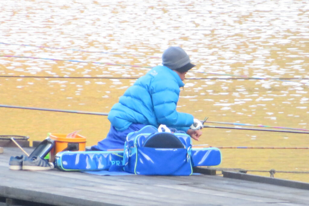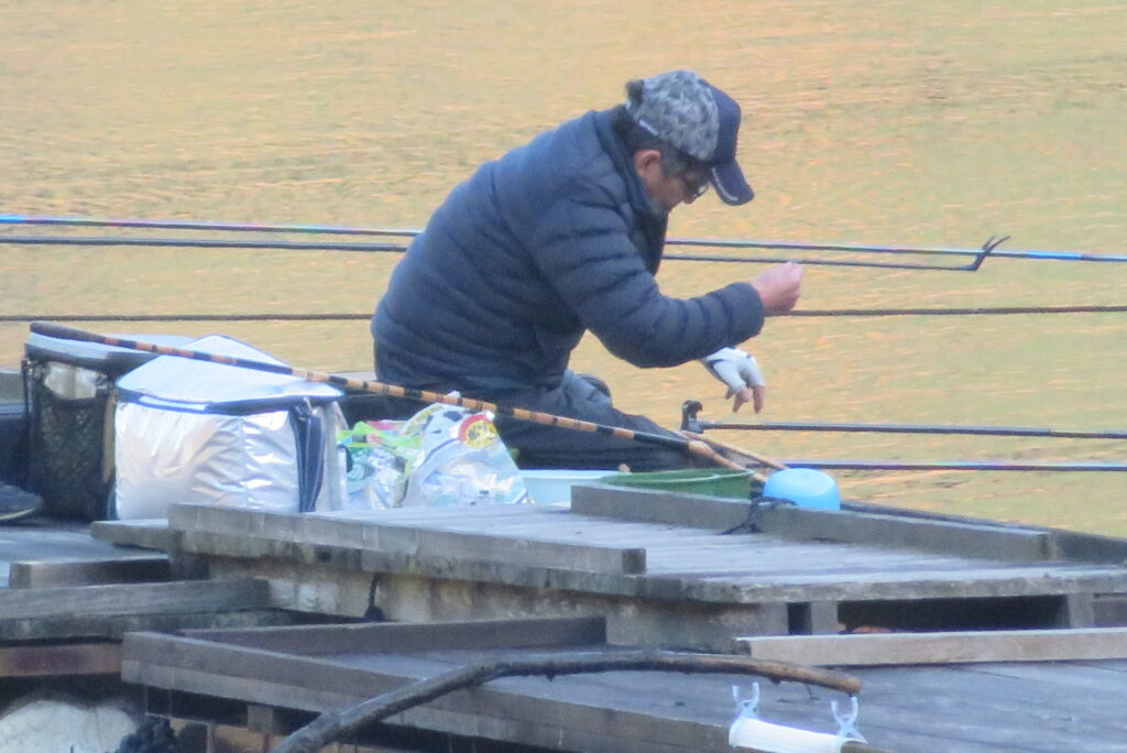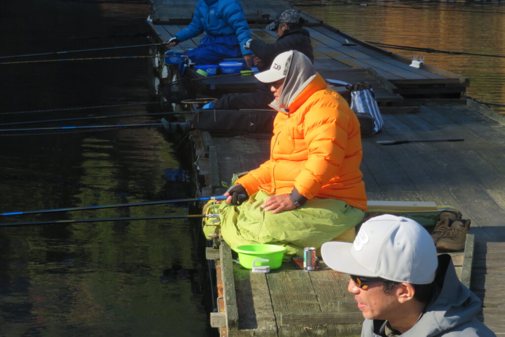 満水・晴れ・無風で穏やかな1日でした。京都の林様5-4号桟橋・竿26尺・床両グルで28㎝~40.5㎝を27枚、豊中の中務様・4-1号桟橋道路向き・竿18尺・床両グルで25㎝~35㎝を27枚、そのほかのお客様も10枚~20枚程度の釣果でした。今朝は2℃まで冷え込みターンオーバーで池水が濁って濃い茶色に変色しました。このターンオーバーの影響か?釣果の中心は午後になってからで、14時以降は桟橋各所で頻繁に竿が曲がっていました。昨日同様、今日も大型ヘラブナが好調で5号桟橋で41.5㎝・40.5㎝が釣れました。4-2号桟橋山向きでは数はあがりませんでしたが、35㎝以上の良型揃いで40㎝超2枚のお客様もありました。最近は連日40㎝超が釣れており、今後も大型ヘラブナが期待できそうです。本日もお越しいただき、ありがとうございました。