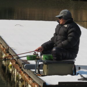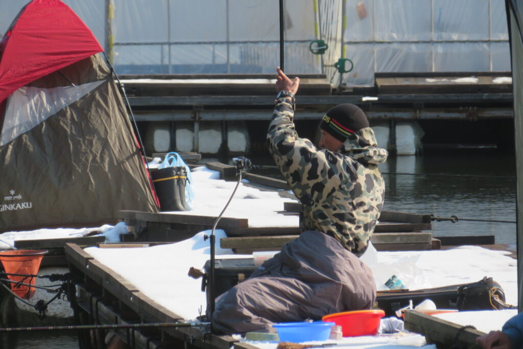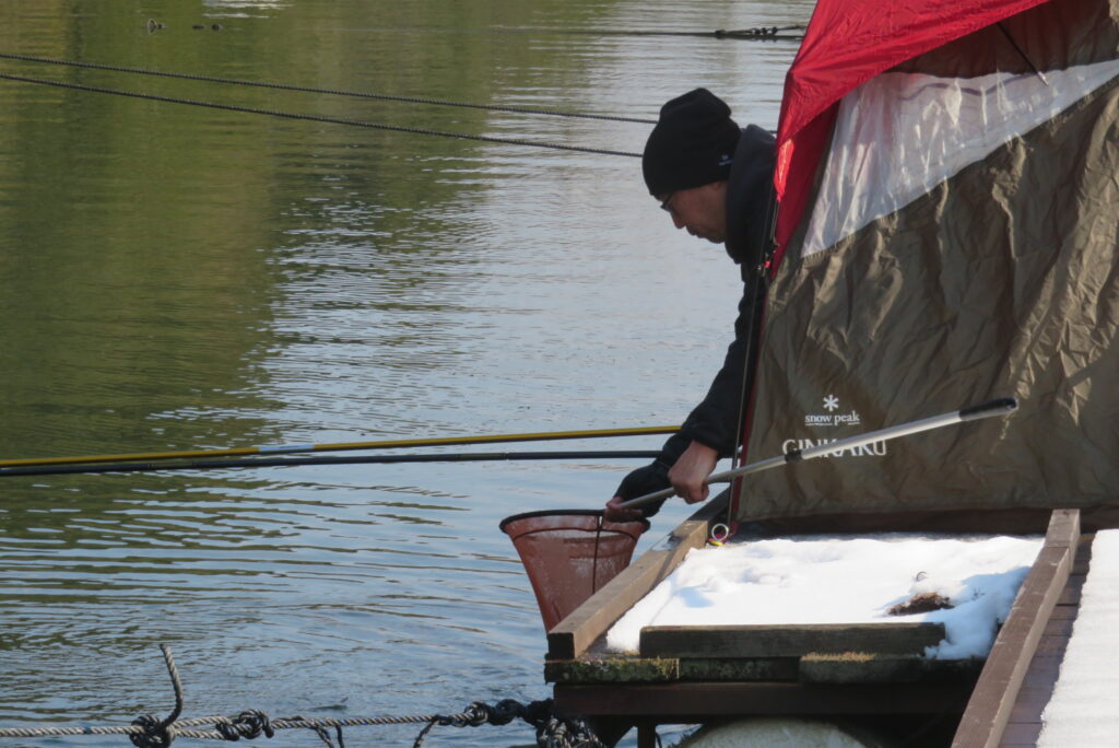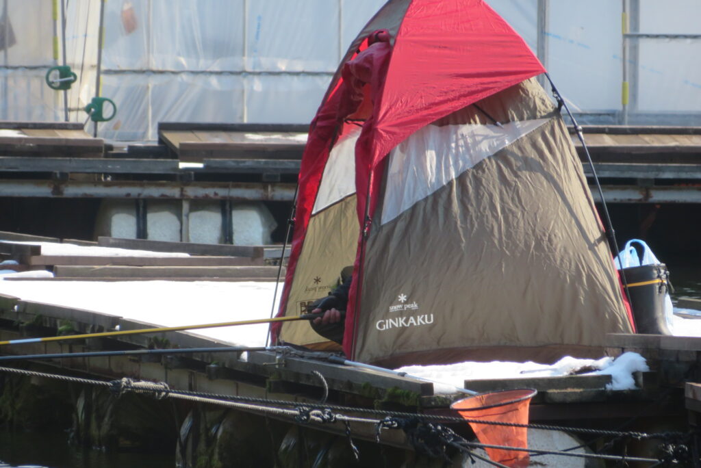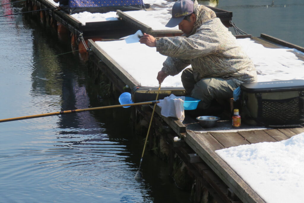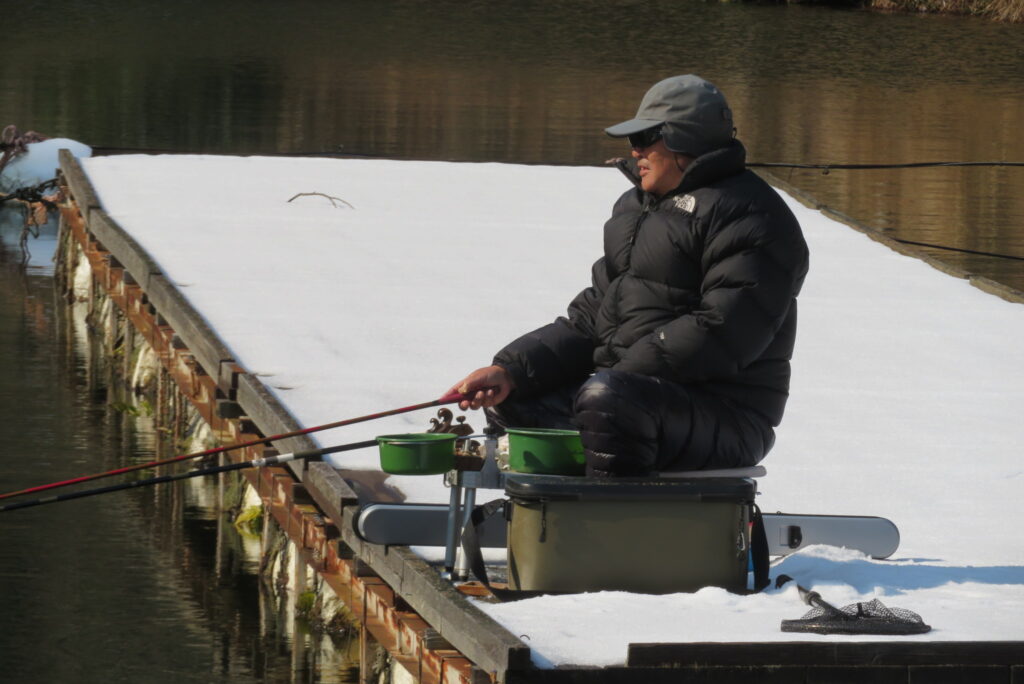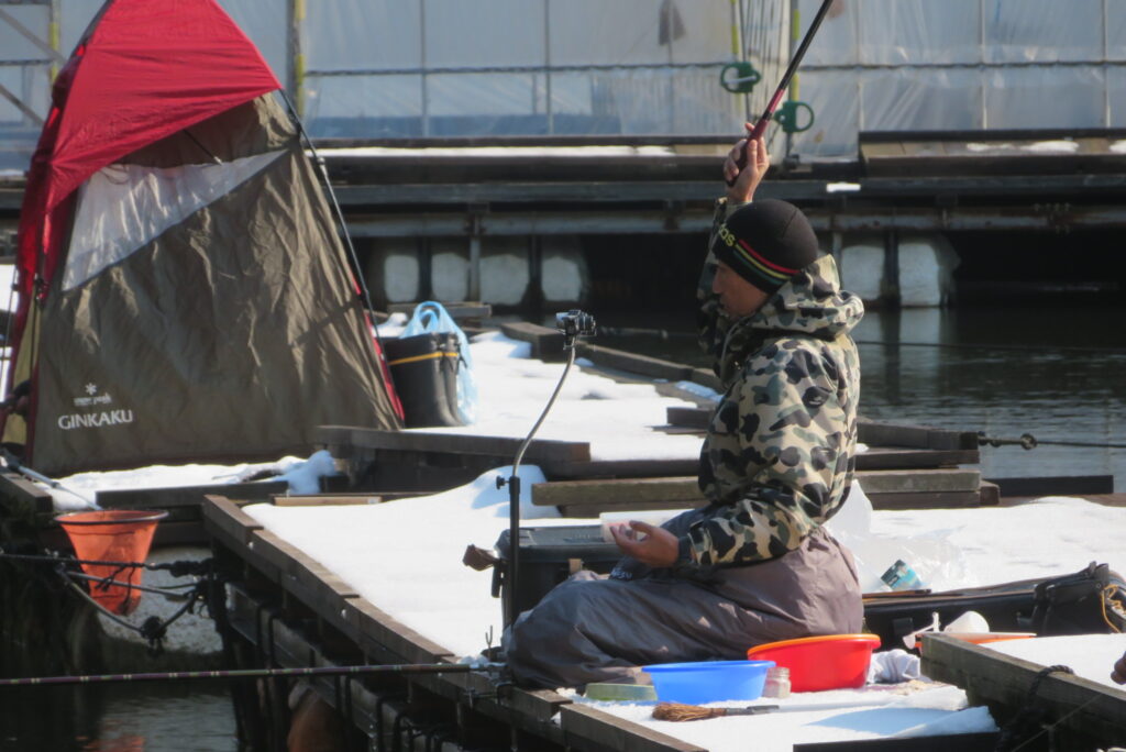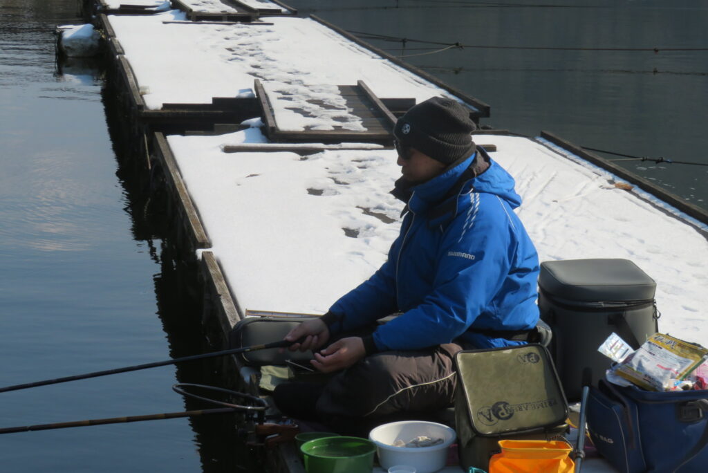 満水・晴れのち曇り・無風の1日でした。大津の堀井様2-2号桟橋・竿18尺、15尺・セットで30㎝~38㎝を35枚、2-2号桟橋・竿19尺、14尺・セットで30㎝~38㎝を16枚、2-3号桟橋・竿27尺・床両グルで30㎝~37㎝を16枚、そのほかのお客様も数枚~14枚の釣果でした。今朝も氷点下まで冷え込みましたが、太陽も顔を出し穏やかな天気でした。2-2号桟橋の本日最多のお客様は、釣り始めから定刻納竿時刻までコンスタントに釣れ続きました。浅場の4-2号桟橋山向きのお客様も床釣りで14枚の釣果で、雪解け水の流入の影響を心配しましたが、ポロポロ釣れました。8号桟橋の短竿・セットのお客様も2桁釣果で、良型が揃いました。明日は朝から夕方まで雪又はミゾレが継続する予報となっています。また強風も予想されており、パラソルでの釣りは厳しそうです。お越し予定のお客様はテントをお持ちください。本日もお越しいただき、ありがとうございました。