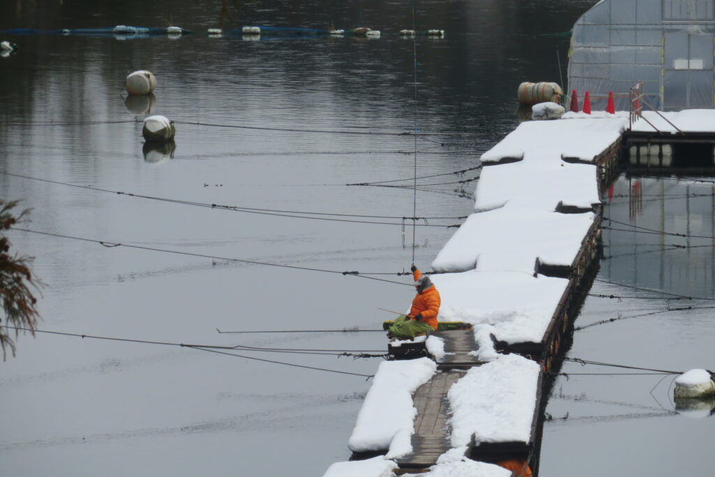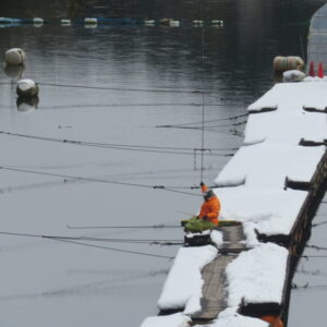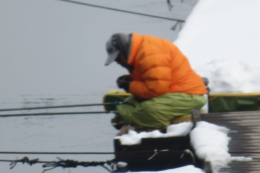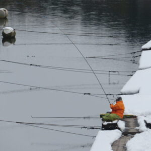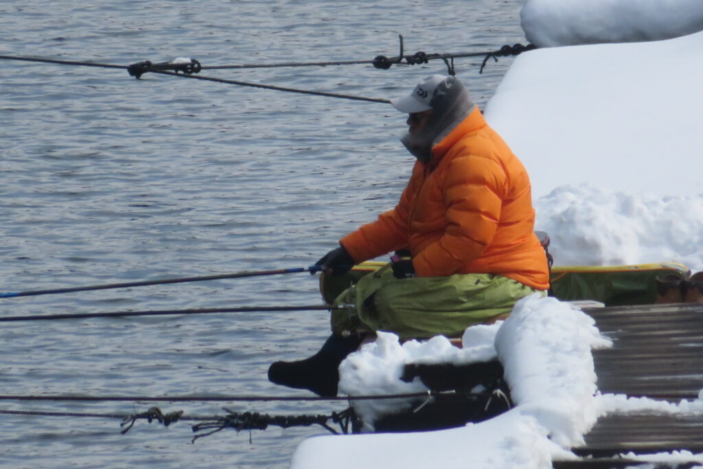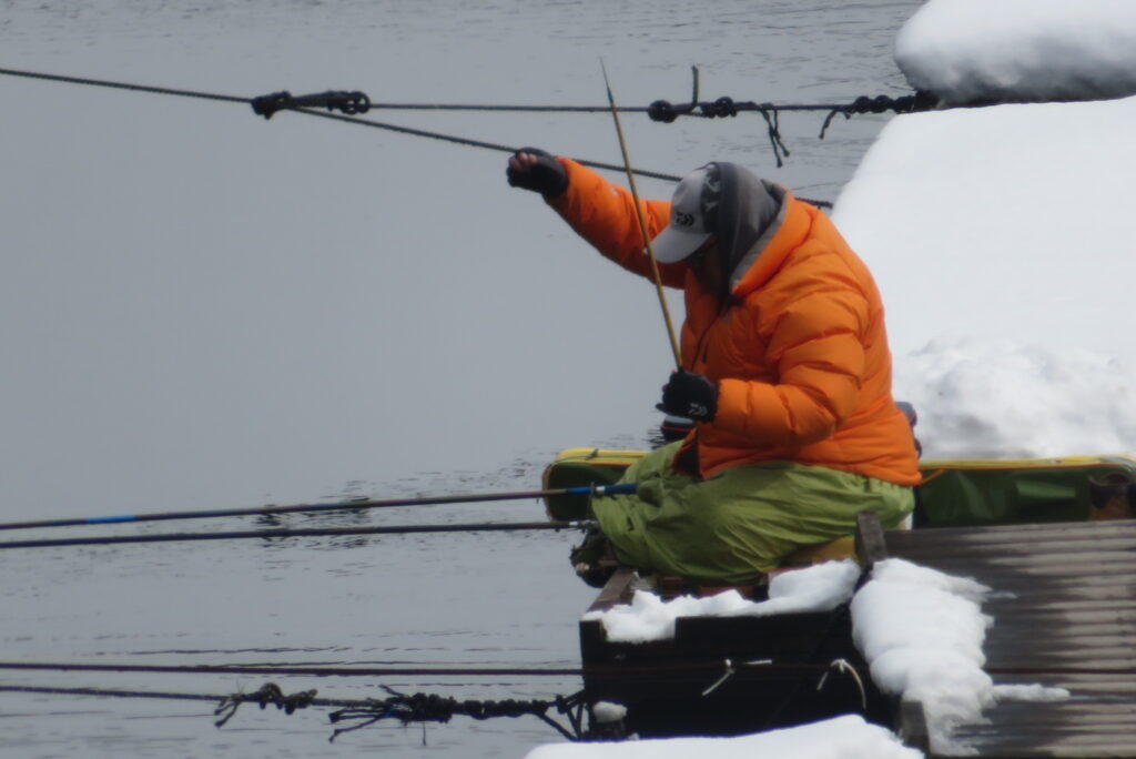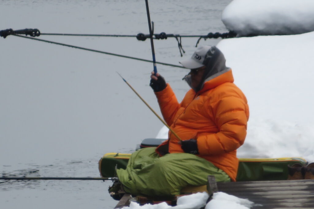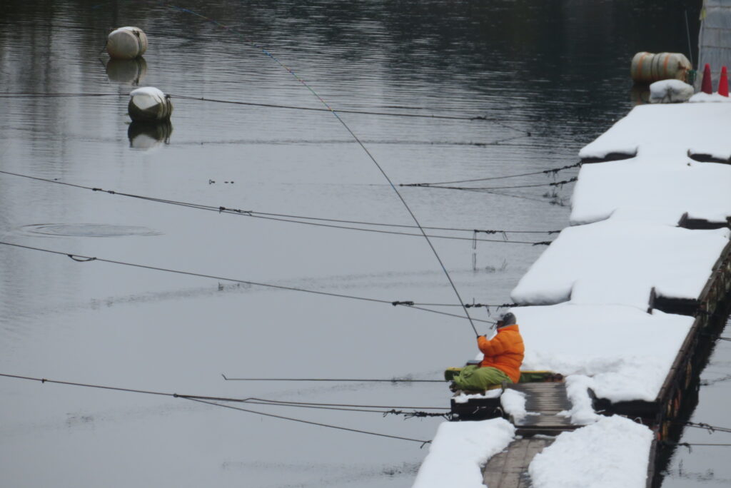 満水・曇り一時晴れ・無風で穏やかな1日でした。京都の林様2-3号桟橋・竿25.5尺・床両ウドンで28㎝~38㎝を31枚(9:00~)の釣果でした。午前中は桟橋真下の足元に良型ヘラブナが20匹程度目視でき、床釣りでも35㎝以上の良型揃いで好釣でした。午後になると30㎝前後のヘラブナの群れが回遊してきて、午前に比べサイズは少し小さくなりましたがアタリが増え、数も伸びて31枚釣果でした。今朝は予想より冷え込みが弱かったものの、池上流部は池面が凍結していました。積雪も半分くらいになり、雪解け水の流入で池水温の低下が一層進んでいるものと思われますが、まだまだヘラブナは釣れます・元気です。今日の日中の気温上昇で雪がとけて桟橋上で10㎝、池周辺道路上はほとんど無くなりなりました。池近接道路の登り坂部の一部箇所に残雪があり、夏用タイヤでは滑って坂が登れませんので、お越しの際は冬用タイヤの装着をお願いします。明日11日は水曜日で定休日ですが、通常営業します。(※11日は1日を通して雨風予報がでているため、朝8時の受付時にお客様が無かった場合は、休業させていただく場合がありますので、ご承知をお願いします。)本日もお越しいただき、ありがとうございました。